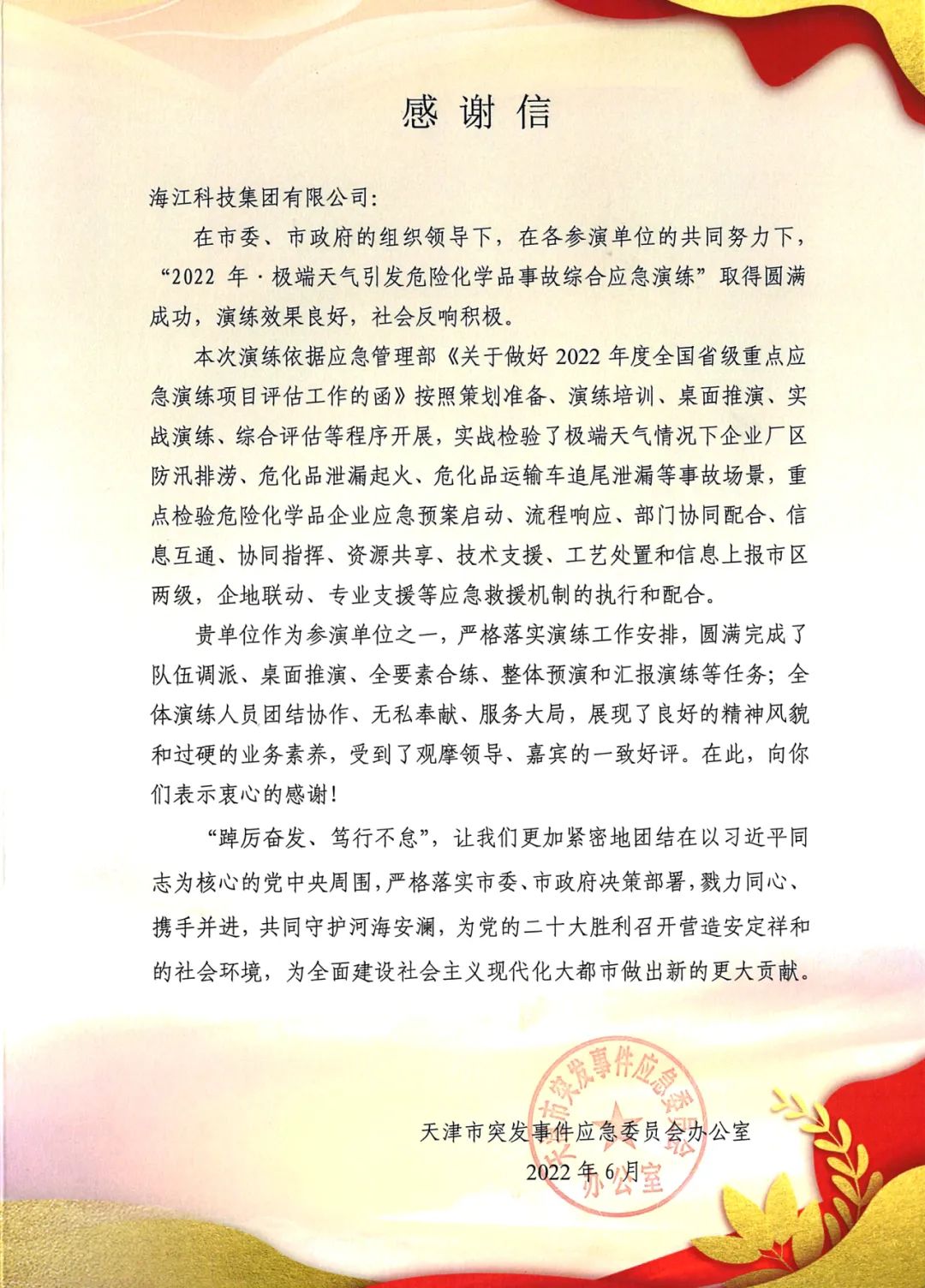 Recently, the Group received a letter of appreciation and an honorary trophy for outstanding contribution to the "2022 - Comprehensive Emergency Response Exercise for Hazardous Chemical Accidents Caused by Extreme Weather" from the Office of Tianjin Emergency Response Committee.